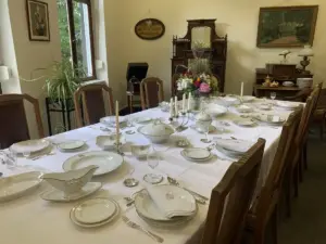 In der ersten Etage haben die Verantwortlichen versucht, die Entwicklung von Formen und Mustern von Porzellan in den Vitrinen darzustellen. Teilweise ist darunter barockes Geschirr zu finden, aber auch Art Déco und Jugendstil, der perfekt zu der alten Villa Grah passt, sind unter den Exponaten. Natürlich ist auch das im Volksmund „Zwiebelmuster“ genannte Geschirr, was eigentlich ein Streublumenmuster darstellt, zu sehen. Sicherlich ein Highlight ist das 30-teilige Service, was im Vortragsraum auf einer lang eingedeckten Tafel zu bestaunen ist. Unter den deutschen Services sind bekannte Marken wie Kahla, Seltmann Weiden, Rosenthal oder Meissen zu finden. Marianne Gorissen wies darauf hin, dass die Manufakturen seinerzeit auf gewisse Regionen begrenzt waren, siedelten sie sich doch zu meist dort an, wo die notwendigen Rohstoffe abgebaut wurden.